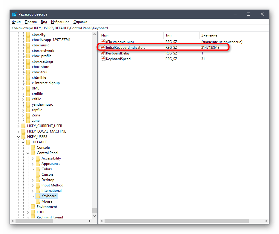 - Найдите параметр «InitialKeyboardIndicators» и дважды кликните на него.