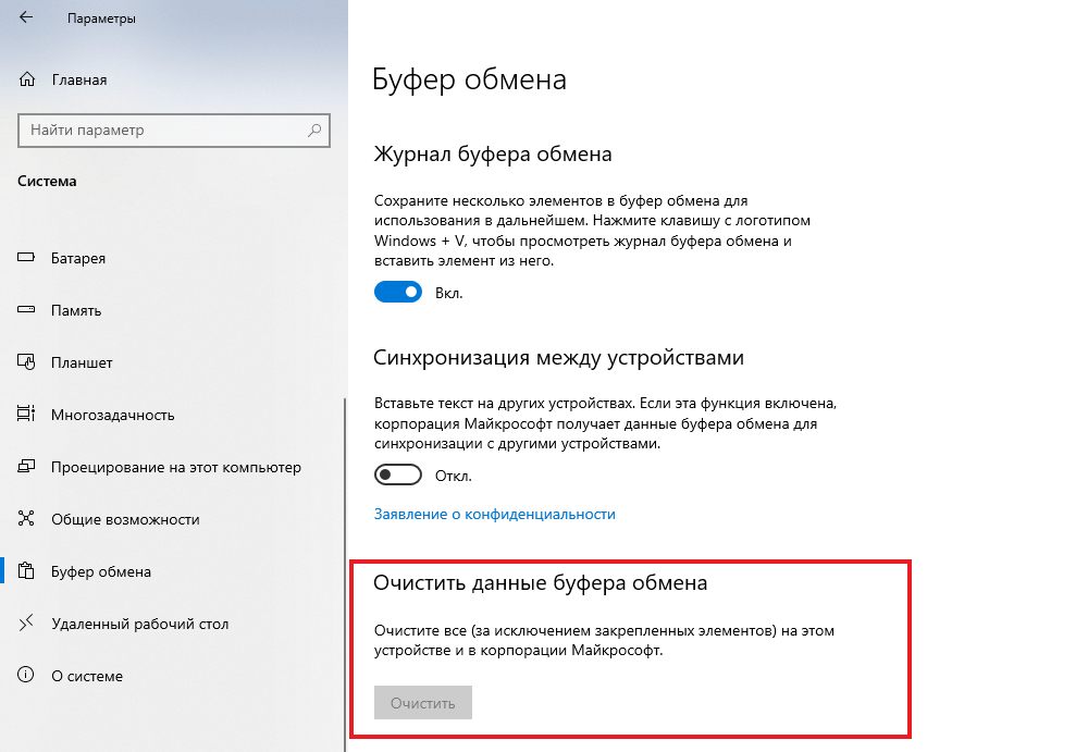 После нажатия на кнопку «Очистить » все данные, находящиеся в буфере обмене, будут удалены.