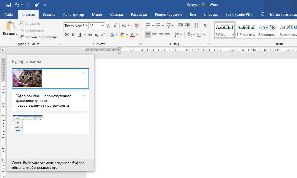 Необходимо отметить, что при внесении в буфер обмена новых данных, предыдущие стираются.