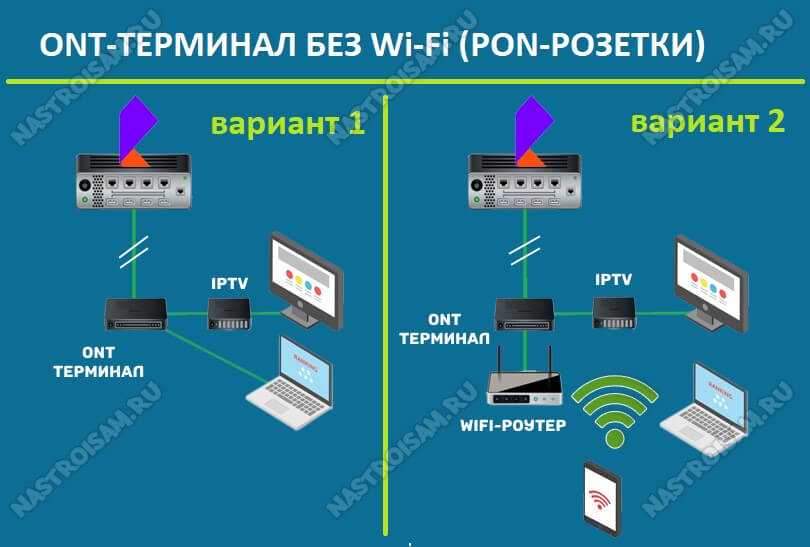 Есть два варианта использования PON-розетки.Первый вариант — это простейший дешевый вариант подключения к Интернету. Тут всё понятно.Второй вариант — подойдёт для более продвинутых пользователей и подразумевает установку дополнительно Wi-Fi роутера или даже целой Mesh-системы. И вот я советую использовать именно такой вариант. Почему? Дело в том, что на момент написания статьи ни у одного производителя я не встречал ни одного оптического PON-терминала с WiFI, который имел бы хорошую зону покрытия. Как правило, она или плохая или так себе. И это не только у Ростелекома, но и у всех других операторов. Возможно у самого топового оптического роутера RT-X дела обстоят получше, но пока протестировать возможности не было. Так вот использование PON-розетки позволяет поставить хороший мощный роутер или МЕШ-систему и забыть о проблемах с беспроводной сетью.