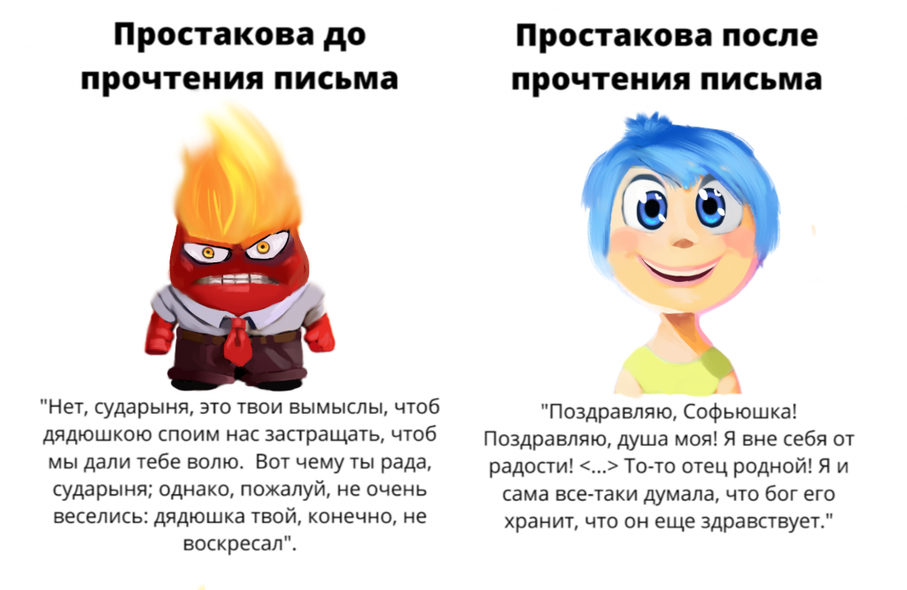 - лицемерная: груба к Софье, но меняет свое отношение, узнав о наследстве.