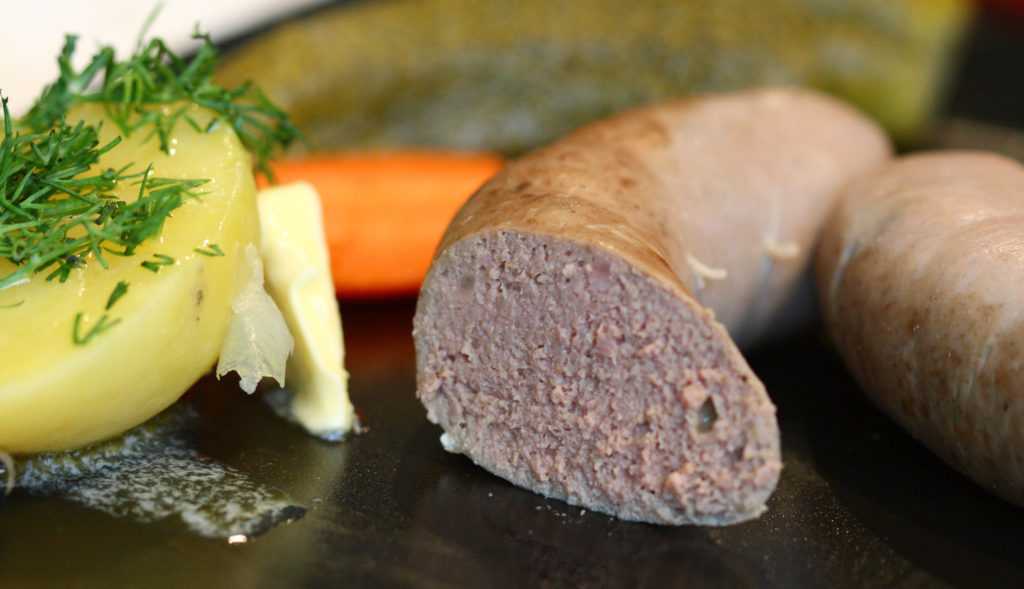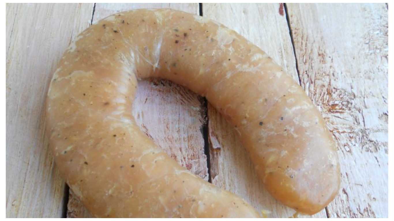 1,5 кг нежирной свинины, 400 г жирной свиной грудинки, 200–300 г нежирной говядины, 20 г посолочной смеси, 2 ст. л. розового перца, 1 ч. л. молотого мускатного ореха, 1 ч. л. молотого имбиря, 1–2 ч. л. майорана. Мясо пропустить через мясорубку, добавить соль, пряности и тщательно перемешать, чтобы масса стала однородной и в меру вязкой. Наполнить фаршем подготовленную свиную череву. В процессе наполнения перекрутить кишку в нескольких местах, разделяя ее на отдельные колбаски длиной 25–30 см. Коптить дымом, нагретым до 80–90 градусов, в течение 1 часа, затем домашняя колбаса варится в течение 30 минут при температуре 65–70 градусов.