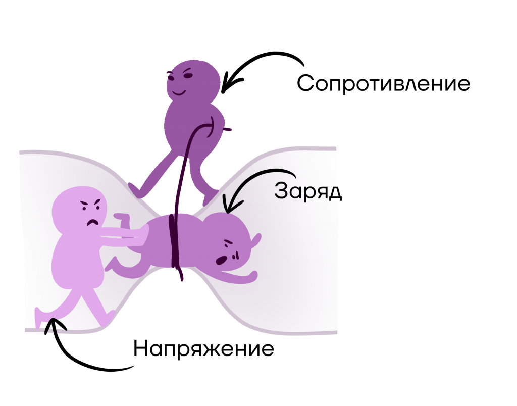 На тему закона Ома есть немало забавных картинок, позволяющих чуть лучше понять все эти явления. Одна из них перед вами и иллюстрирует, как ток зависит от напряжения и сопротивления. Смотрите что получается: сопротивление старается уменьшить ток (обратная зависимость), а с ростом напряжения он увеличивается (прямая зависимость). Это и есть закон Ома, но переданный простыми словами.