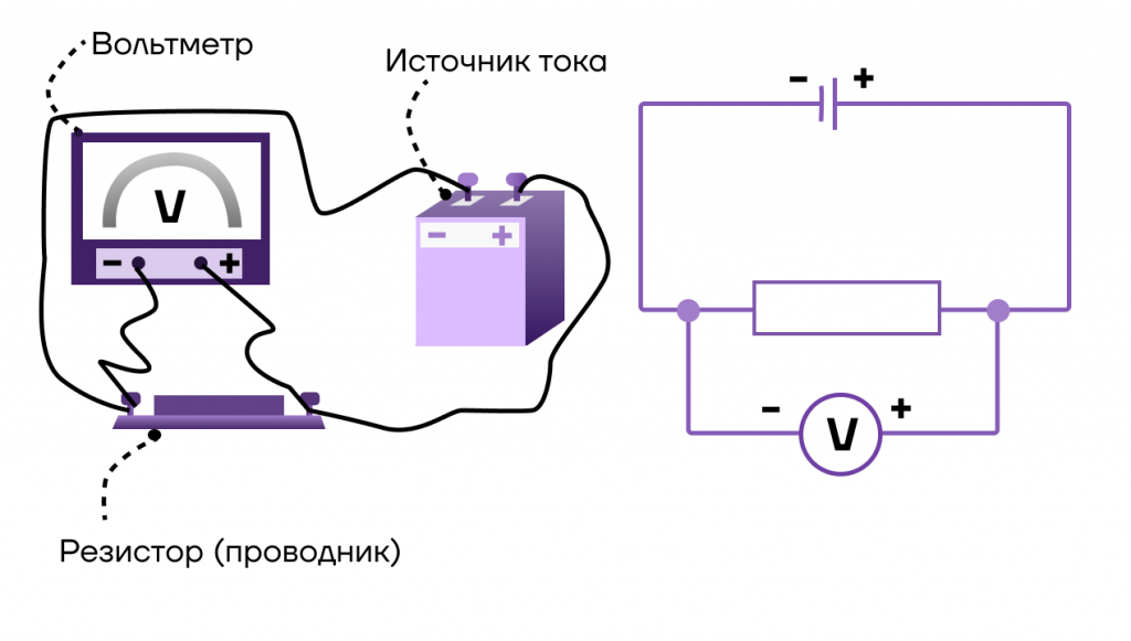 В этой схеме используются два измерительных прибора: амперметр включается последовательно с нагрузкой (резистор на схеме ниже), вольтметр параллельно нагрузке.