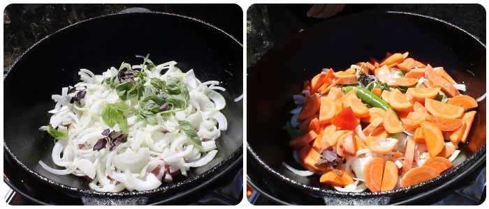- Очистите картофель и морковь, нарежьте их кубиками. Добавьте овощи в казан к мясу и продолжайте готовить на умеренном огне, пока овощи не станут мягкими (примерно 10-15 минут).