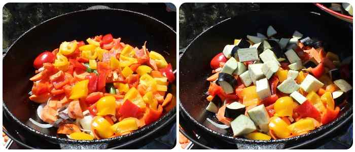 - Дальше послойно кладутся баклажаны, помидоры с зубчиками чеснока, весь картофель и еще один острый перец, затем второй слой говядины.