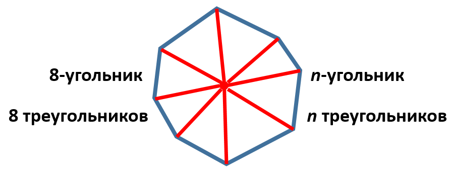 2. Можно также выбрать точку внутри выпуклого многоугольника и соединить её со всеми вершинами. Тогда наш n-угольник разобьется на треугольников: