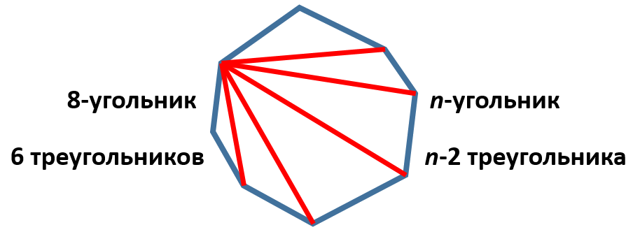 1. Разобьём выпуклый многоугольник на треугольники всеми возможными диагоналями, проведёнными из какой-нибудь вершины. Легко понять, что тогда наш n-угольник разобьётся на треугольника: