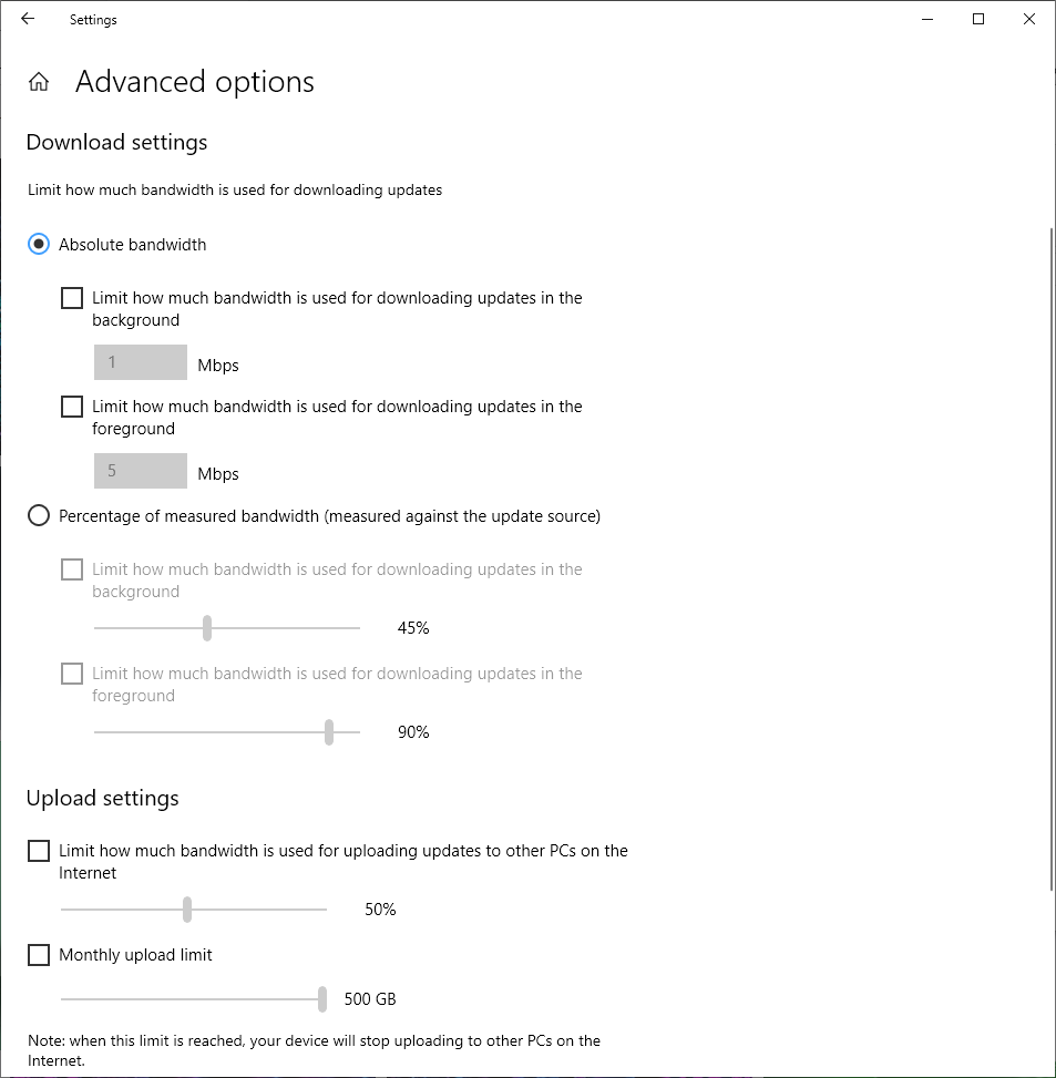 - Здесь вы можете изменить ползунки для параметров загрузки и выгрузки, а также настроить объем пропускной способности, которую вы хотите зарезервировать для обновлений.