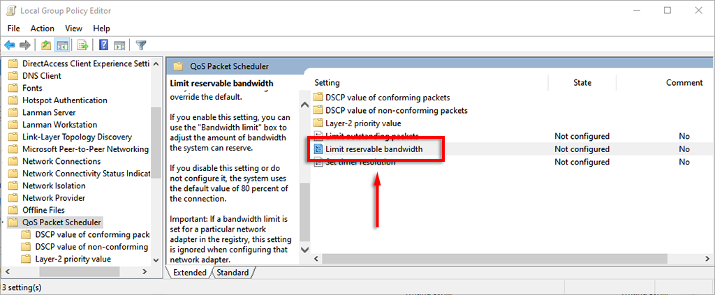 - Выбрав Планировщик пакетов QoS(QoS Packet Scheduler ) , дважды щелкните Ограничить резервируемую пропускную способность(Limit Reservable Bandwidth ) на правой панели.