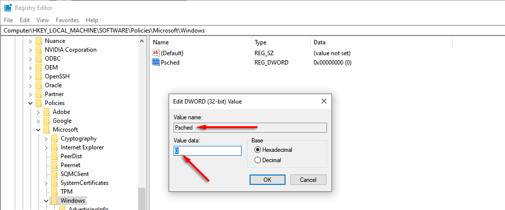- Назовите его Пшед(Psched) . Теперь вы сможете изменить процент резервируемой пропускной способности по умолчанию в разделе « Значение данных(Value data) » . Нажмите OK , чтобы сохранить изменения.