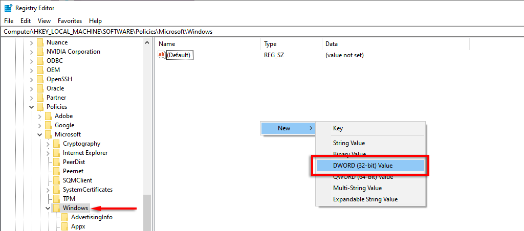 - Если Psched не существует, выберите Windows , щелкните правой кнопкой мыши где-нибудь на правой панели и выберите « Создать(New ) » > « Значение DWORD (32-разрядное)»(DWORD (32-bit) Value) .