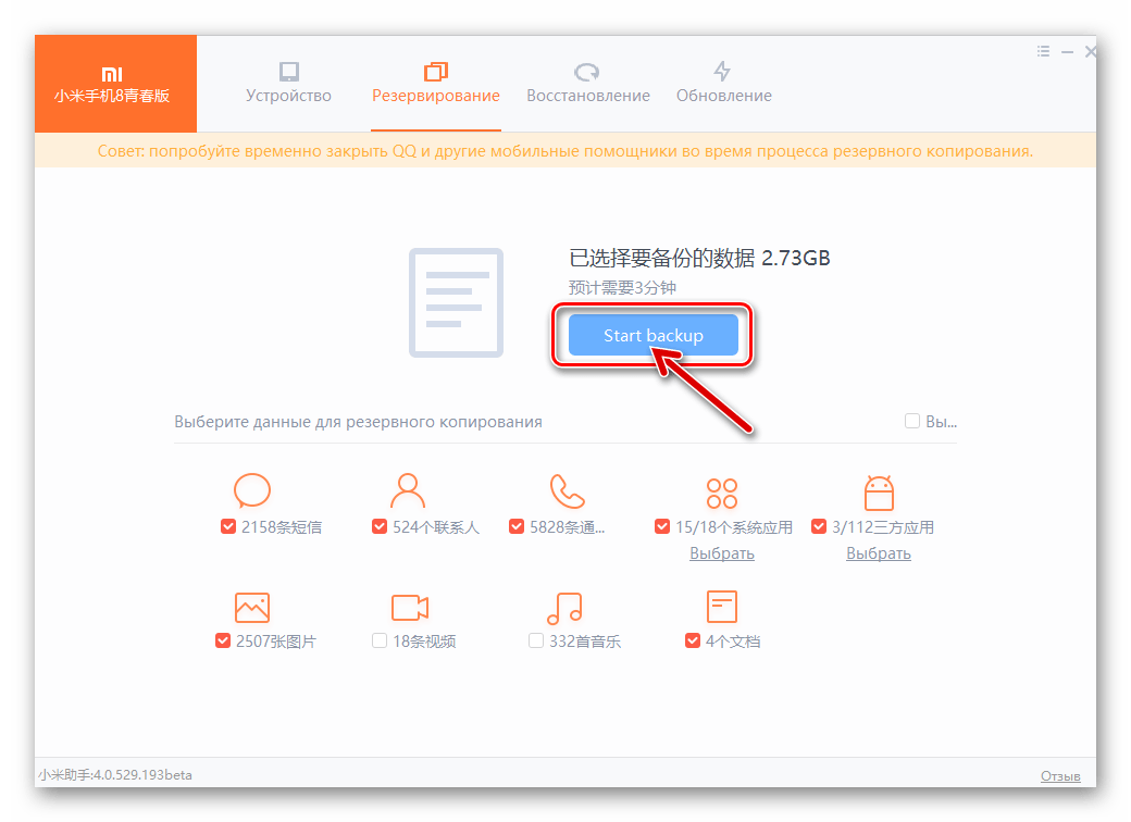 Завершив выбор копируемой со смартфона информации, нажмите «Start Backup» в окне MiPhoneAssistant.