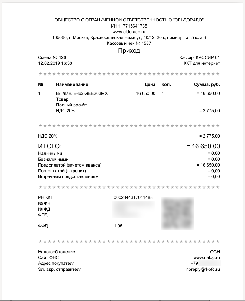 - MiAl 14.02.2019 at 05:11 Такие чеки приходят и при покупке в офлайн магазине. Чек, который в этой заметке, именно из обычного магазина (магазин электроники «Эльдорадо»). Reply