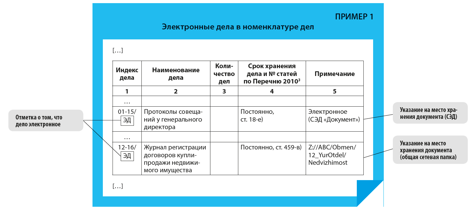 Дела, которые ведутся в организации в электронном виде, в номенклатуре дел отражаются на общих основаниях. Никакой «дискриминации» по носителю устраивать не нужно. Заголовки дел располагаются в необходимом порядке. При этом электронные дела сопровождаются специальными отметками (Пример 1).