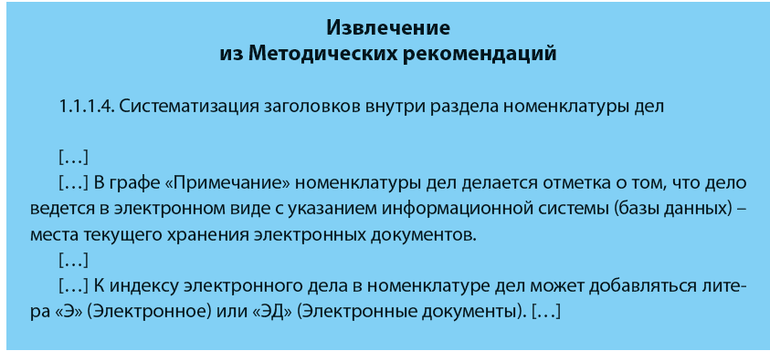 Электронные документы формируются в электронные дела в соответствии с номенклатурой дел. В номенклатуре дел указывается, что дело ведется в электронной форме, что отмечается в заголовке дела или в графе «Примечание». . Все электронные документы, независимо от их объема, включаются в одно электронное дело… 8.17. …