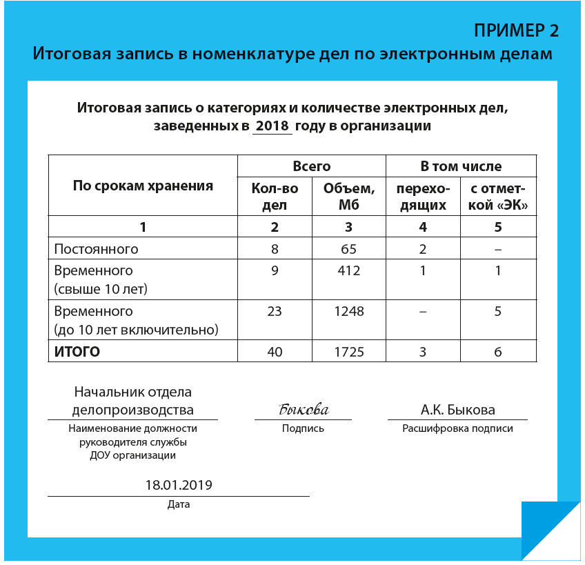 Ежегодно к номенклатуре дел составляется итоговая запись. Для учета электронных дел лучше составить отдельную итоговую запись, в которой указывается количество сформированных электронных дел (по срокам хранения) и их объем в Мб (разд. 1.1.1.4 Методических рекомендаций). Только в форме итоговой записи, предложенной Правилами 2015, не содержится специального поля для отметки об объеме электронных дел, поэтому объем может быть указан произвольно. Можно включить для этого в итоговую запись отдельную графу (Пример 2).