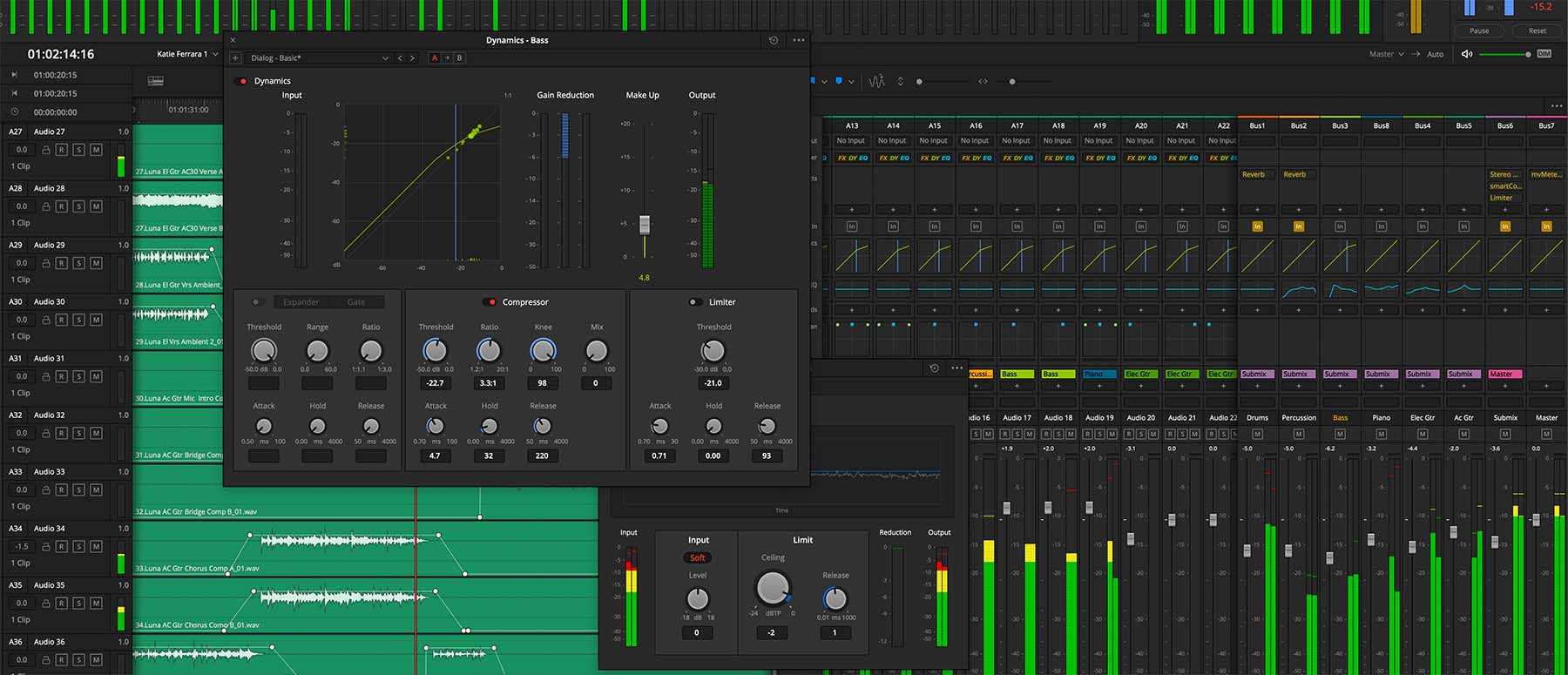 Resolve comes with native Fairlight FX audio plug-ins that cover most common needs. But since this software is targeted towards the film and TV post customer, it doesn’t include music-centric plug-ins, like the guitar amp and pedal emulations offered in Apple’s Logic Pro. That focus is true of the plug-in presets, as well. For example, the factory preset choices in the compressor will be for dialogue and not musical instruments, such as a drum kit or guitar. That won’t keep you from working on music with these plug-ins. Presets are just suggestions anyway, so you should tweak based on what sounds right to you.