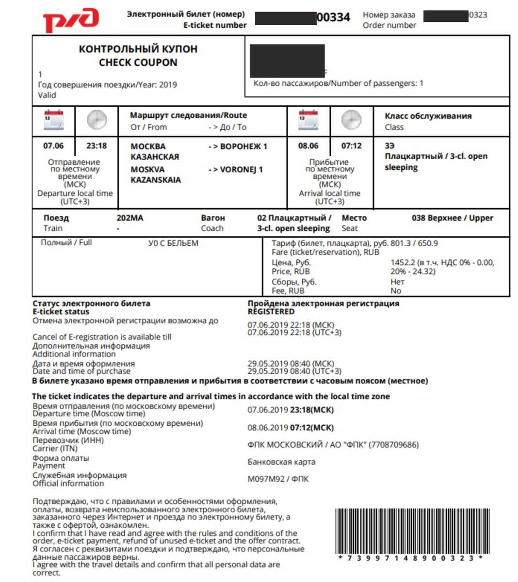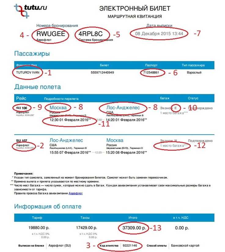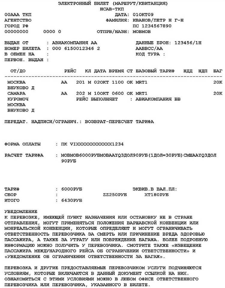 Вместе с экземпляром билета на почту приходит маршрут-квитанция. Она отображает данные о месте посадки и высадки, а также условиях перелета.