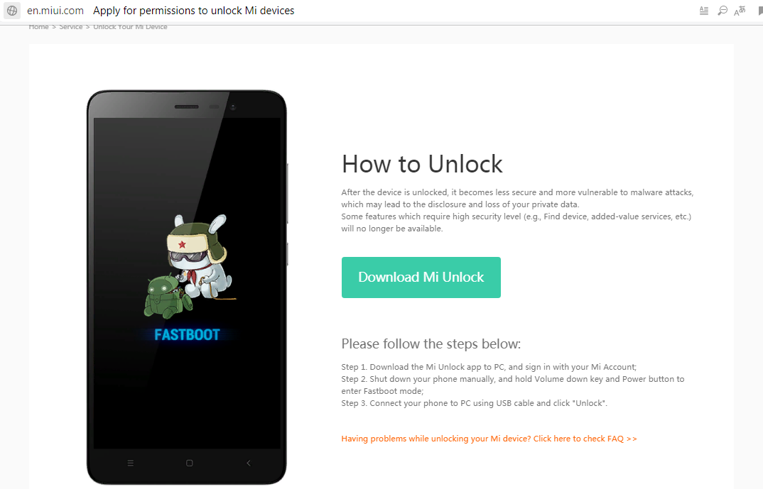 На этот раз у нас откроется окно с инструкцией, что нам делать дальше и зеленой кнопкой для скачивания программы. Качаем Mi Unlock.