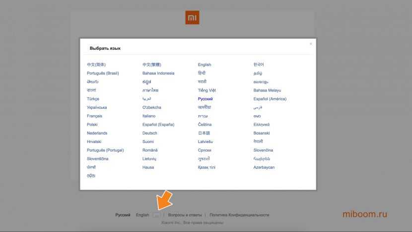 Сайт account.xiaomi.com на русском языке отображается автоматически. Автоопределение региона может не срабатывать и выбирать язык приходится вручную.