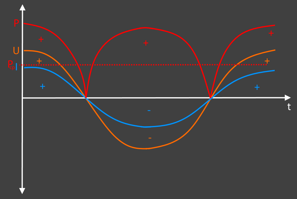 Теперь по двум синусоидам строим график мощности по формуле мощность равна силе тока умноженной на напряжение (P = I × U). Так как напряжение и ток имеют общие нулевые точки, то график мощности не будет заходить в отрицательную область. То есть сила тока со знаком «+» и напряжение со знаком «+» дадут мощность со знаком «+», так же как и сила тока со знаком «-» и напряжение со знаком «-» дадут мощность со знаком «+».