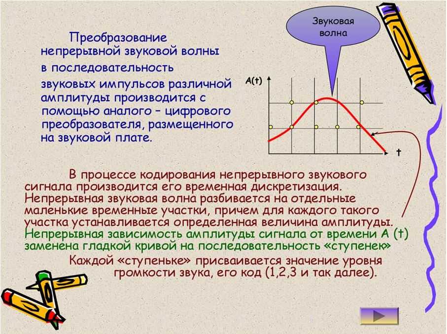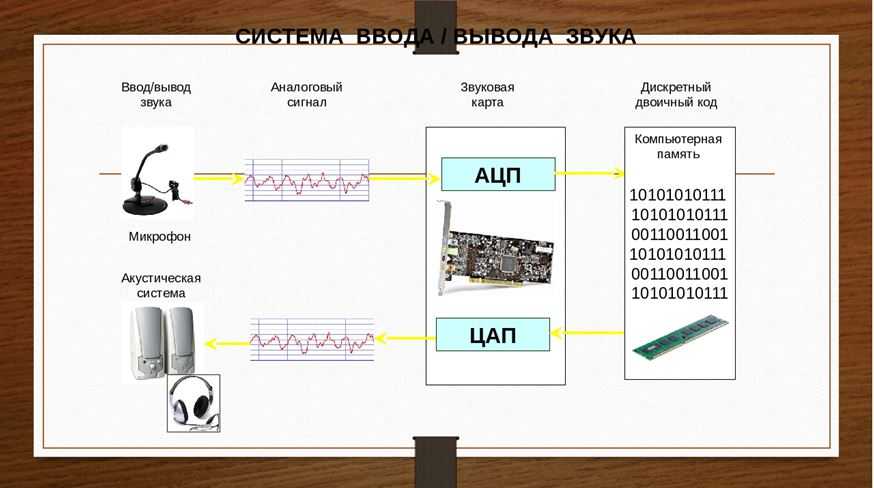 Микрофон позволят принять звуковые волны, а при помощи звуковой карты перевести их в электрический сигнал. Непрерывные звуки преобразовываются в последовательность нулей и единиц. При обратном воспроизведении (при помощи колонок или наушников) звук переводится из дискретной формы в непрерывную. Это тоже функция аудиоадаптера или звуковой карты.