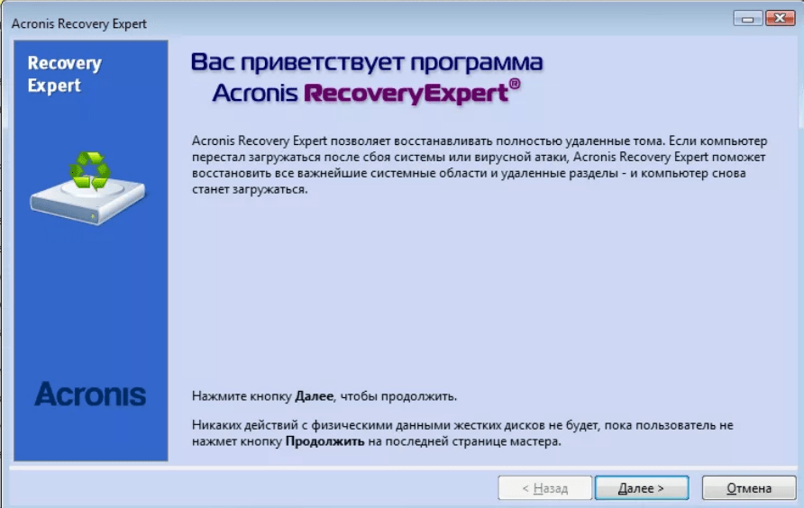 Тут не обойтись без дополнительных средств. Вам понадобиться программа Acronis Disk Director, которая входит в состав аварийных дисков. Нужно скачать ее и сделать загрузочную флешку или диск. Затем запустить Acronis Recovery Expert. Cмотрим небольшое видео по этой программе: