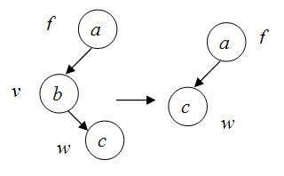 - если v не лист и не корень дерева, то ссылка у f, указывающая на v, будет указывать на w.