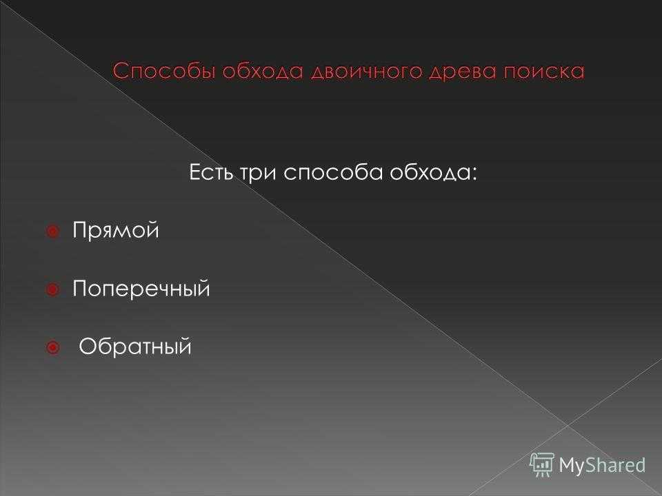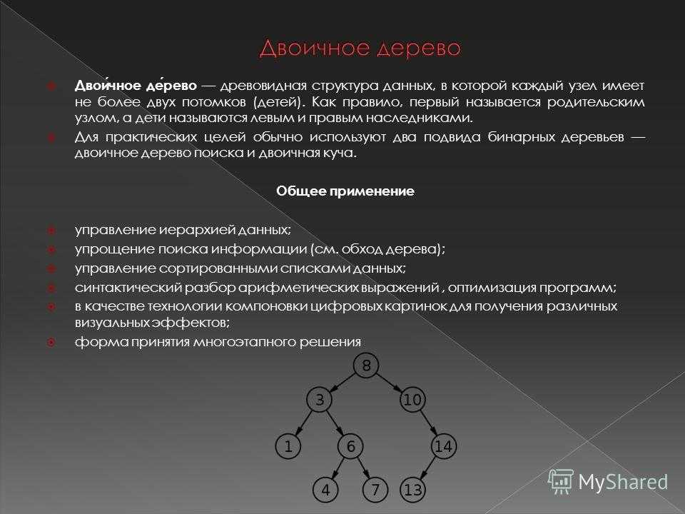 Двоичное дерево древовидная структура данных, в которой каждый узел имеет не более двух потомков (детей). Как правило, первый называется родительским узлом, а дети называются левым и правым наследниками. Для практических целей обычно используют два подвида бинарных деревьев двоичное дерево поиска и двоичная куча. Общее применение управление иерархией данных; упрощение поиска информации (см. обход дерева); управление сортированными списками данных; синтактический разбор арифметических выражений, оптимизация программ; в качестве технологии компоновки цифровых картинок для получения различных визуальных эффектов; форма принятия многоэтапного решения