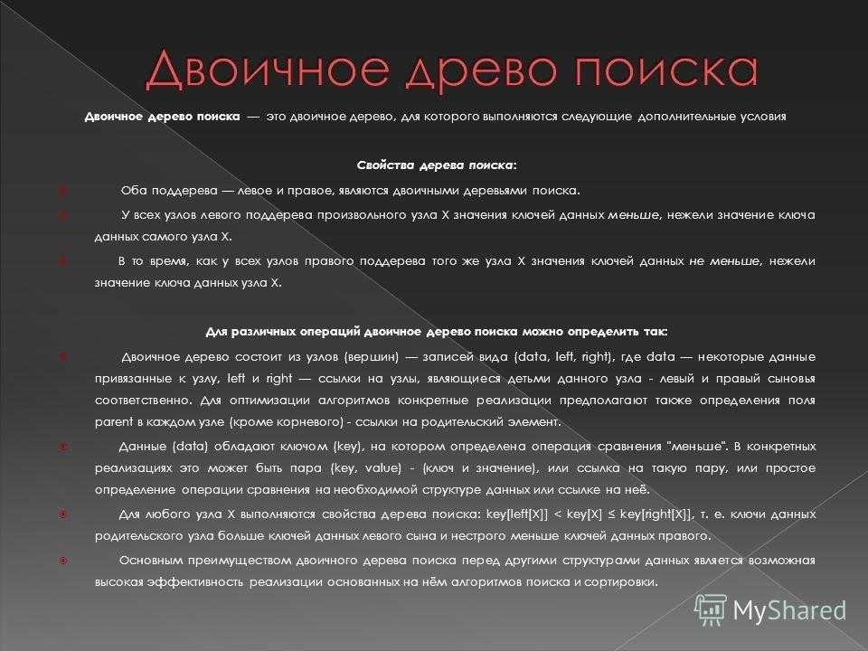Двоичное дерево поиска это двоичное дерево, для которого выполняются следующие дополнительные условия Свойства дерева поиска : Оба поддерева левое и правое, являются двоичными деревьями поиска. У всех узлов левого поддерева произвольного узла X значения ключей данных меньше, нежели значение ключа данных самого узла X. В то время, как у всех узлов правого поддерева того же узла X значения ключей данных не меньше, нежели значение ключа данных узла X. Для различных операций двоичное дерево поиска можно определить так: Двоичное дерево состоит из узлов (вершин) записей вида (data, left, right), где data некоторые данные привязанные к узлу, left и right ссылки на узлы, являющиеся детьми данного узла — левый и правый сыновья соответственно. Для оптимизации алгоритмов конкретные реализации предполагают также определения поля parent в каждом узле (кроме корневого) — ссылки на родительский элемент. Данные (data) обладают ключом (key), на котором определена операция сравнения «меньше». В конкретных реализациях это может быть пара (key, value) — (ключ и значение), или ссылка на такую пару, или простое определение операции сравнения на необходимой структуре данных или ссылке на неё. Для любого узла X выполняются свойства дерева поиска: key]