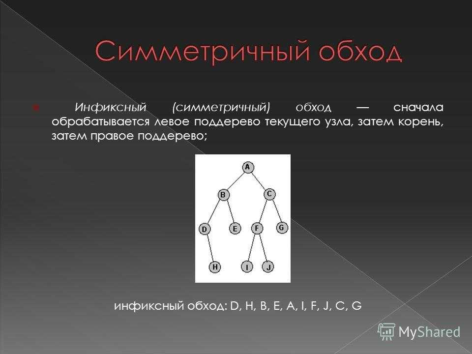 Инфиксный (симметричный) обход сначала обрабатывается левое поддерево текущего узла, затем корень, затем правое поддерево; инфиксный обход: D, H, B, E, A, I, F, J, C, G