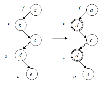 Рассмотрим более подробно правое удаление. Предположим, что минимальный ключ в правом поддереве вершины v имела вершина z. Запишем ключ вершины z в вершину v, что приведёт к тому, что в дереве появятся две вершины v и z с одинаковыми ключевыми значениями, а это недопустимо для бинарного поискового дерева.