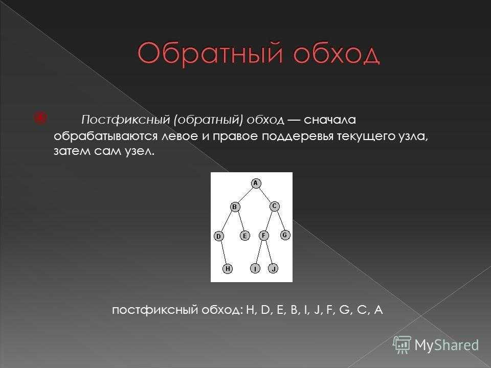 Постфиксный (обратный) обход сначала обрабатываются левое и правое поддеревья текущего узла, затем сам узел. постфиксный обход: H, D, E, B, I, J, F, G, C, A