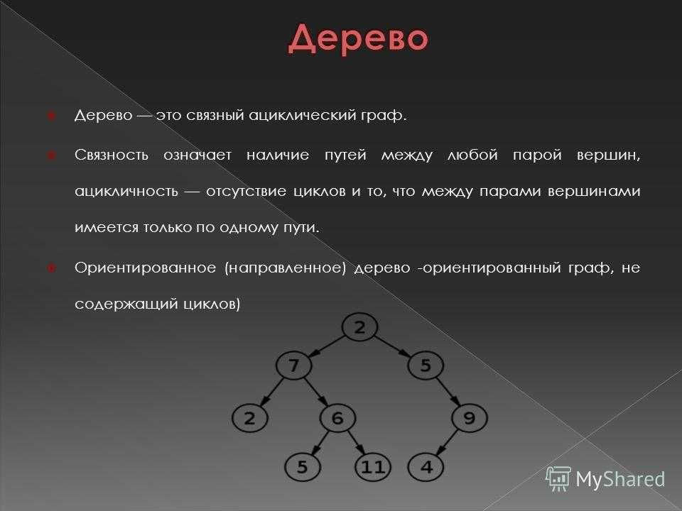 Дерево это связный ациклический граф. Связность означает наличие путей между любой парой вершин, ацикличность отсутствие циклов и то, что между парами вершинами имеется только по одному пути. Ориентированное (направленное) дерево -ориентированный граф, не содержащий циклов)