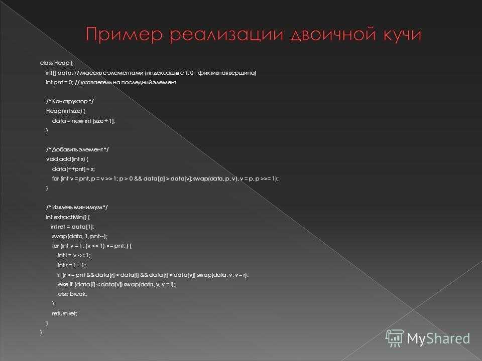 class Heap { int[] data; // массив с элементами (индексация с 1, 0 — фиктивная вершина) int pnt = 0; // указаетель на последний элемент /* Конструктор */ Heap(int size) { data = new int ; } /* Добавить элемент */ void add(int x) { data = x; for (int v = pnt, p = v >> 1; p > 0 && data > data; swap(data, p, v), v = p, p >>= 1); } /* Извлечь минимум */ int extractMin() { int ret = data; swap(data, 1, pnt—); for (int v = 1; (v