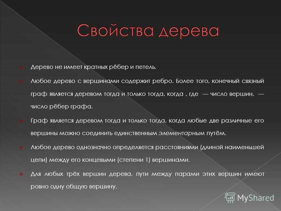- Для любых трех вершин в дереве три пути между ними имеют ровно одну общую вершину (эта вершина называется медианой этих трех вершин).