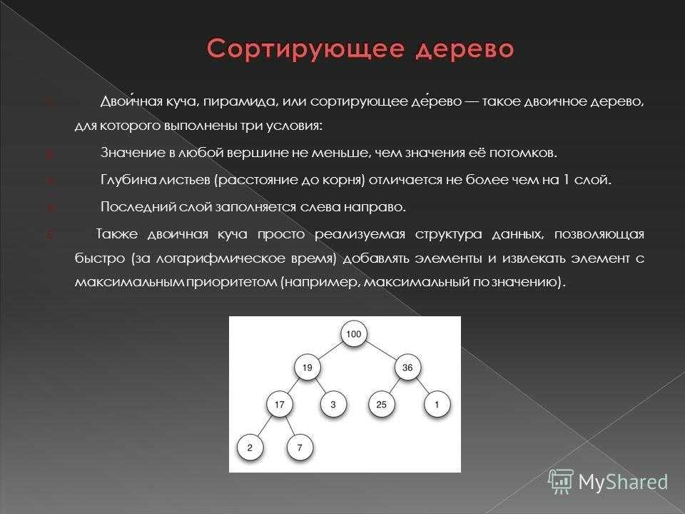 1. Двоичная куча, пирамида, или сортирующее дерево такое двоичное дерево, для которого выполнены три условия: 2. Значение в любой вершине не меньше, чем значения её потомков. 3. Глубина листьев (расстояние до корня) отличается не более чем на 1 слой. 4. Последний слой заполняется слева направо. 5. Также двоичная куча просто реализуемая структура данных, позволяющая быстро (за логарифмическое время) добавлять элементы и извлекать элемент с максимальным приоритетом (например, максимальный по значению).