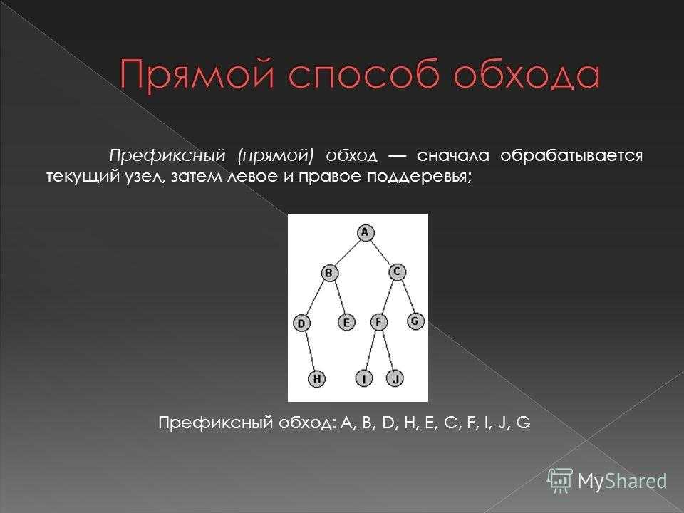 Префиксный (прямой) обход сначала обрабатывается текущий узел, затем левое и правое поддеревья; Префиксный обход: A, B, D, H, E, C, F, I, J, G