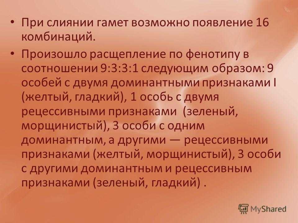 При слиянии гамет возможно появление 16 комбинаций. Произошло расщепление по фенотипу в соотношении 9:3:3:1 следующим образом: 9 особей с двумя доминантными признаками I (желтый, гладкий), 1 особь с двумя рецессивными признаками (зеленый, морщинистый), 3 особи с одним доминантным, а другими рецессивными признаками (желтый, морщинистый), 3 особи с другими доминантным и рецессивным признаками (зеленый, гладкий).