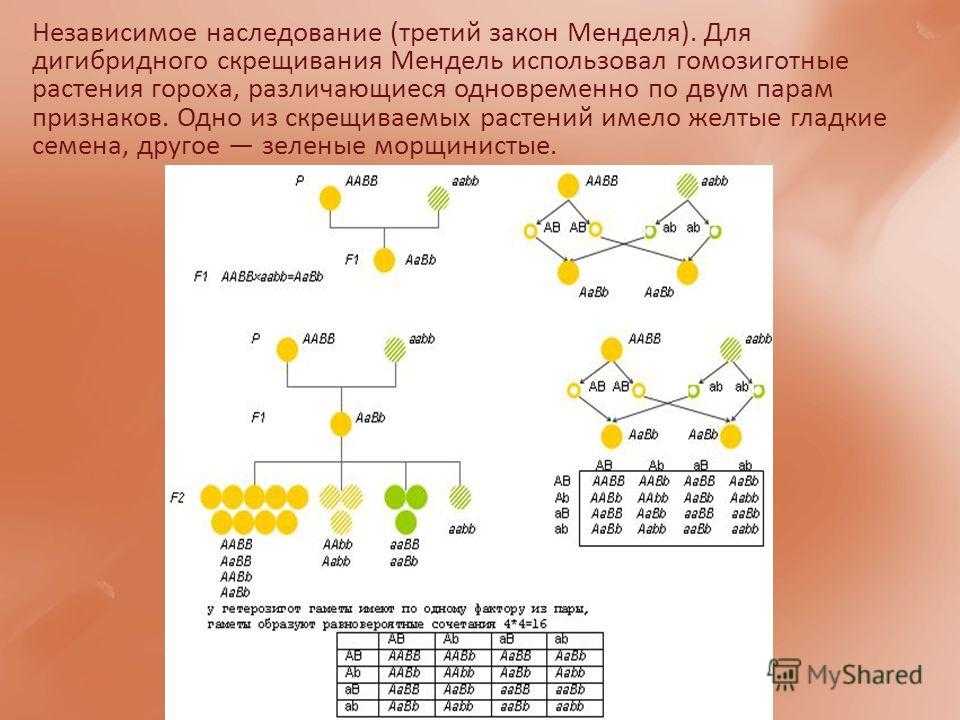 Независимое наследование (третий закон Менделя). Для дигибридного скрещивания Мендель использовал гомозиготные растения гороха, различающиеся одновременно по двум парам признаков. Одно из скрещиваемых растений имело желтые гладкие семена, другое зеленые морщинистые.