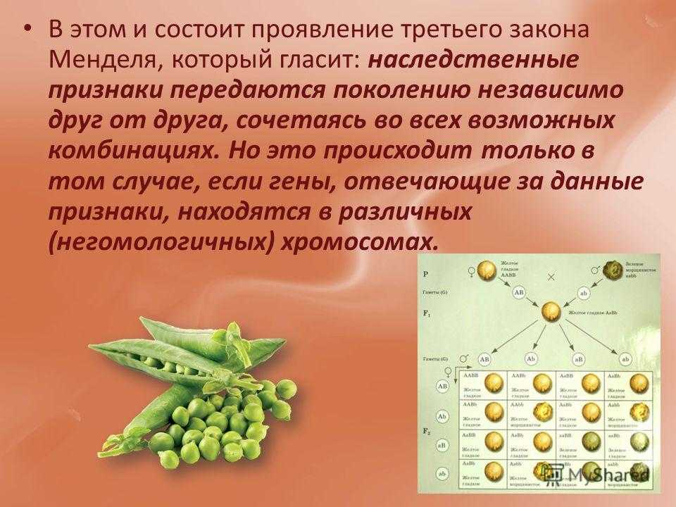 В этом и состоит проявление третьего закона Менделя, который гласит: наследственные признаки передаются поколению независимо друг от друга, сочетаясь во всех возможных комбинациях. Но это происходит только в том случае, если гены, отвечающие за данные признаки, находятся в различных (негомологичных) хромосомах.