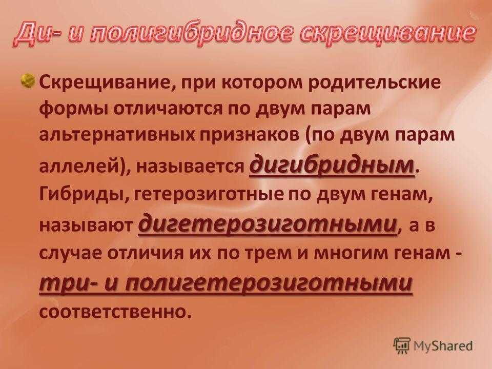 дигибридным дигетерозиготными три- и полигетерозиготными Скрещивание, при котором родительские формы отличаются по двум парам альтернативных признаков (по двум парам аллелей), называется дигибридным. Гибриды, гетерозиготные по двум генам, называют дигетерозиготными, а в случае отличия их по трем и многим генам — три- и полигетерозиготными соответственно.