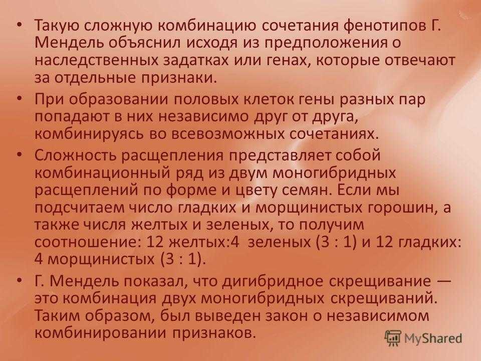 Такую сложную комбинацию сочетания фенотипов Г. Мендель объяснил исходя из предположения о наследственных задатках или генах, которые отвечают за отдельные признаки. При образовании половых клеток гены разных пар попадают в них независимо друг от друга, комбинируясь во всевозможных сочетаниях. Сложность расщепления представляет собой комбинационный ряд из двум моногибридных расщеплений по форме и цвету семян. Если мы подсчитаем число гладких и морщинистых горошин, а также числя желтых и зеленых, то получим соотношение: 12 желтых:4 зеленых (3 : 1) и 12 гладких: 4 морщинистых (3 : 1). Г. Мендель показал, что дигибридное скрещивание это комбинация двух моногибридных скрещиваний. Таким образом, был выведен закон о независимом комбинировании признаков.