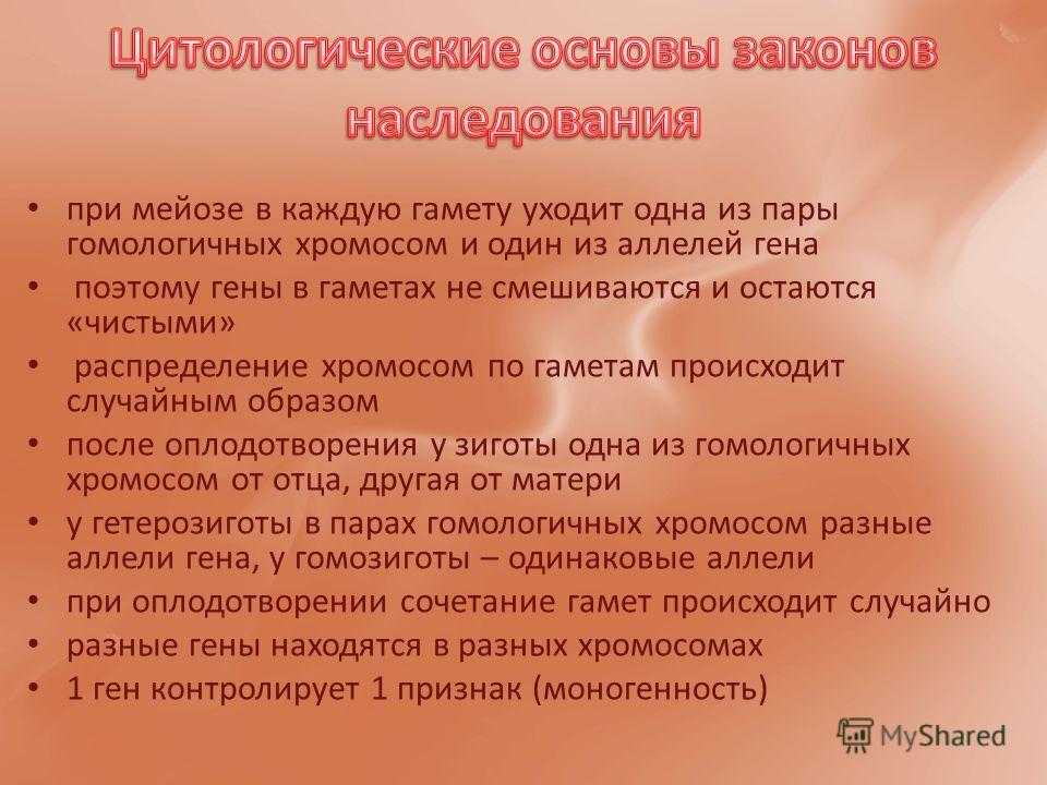 при мейозе в каждую гамету уходит одна из пары гомологичных хромосом и один из аллелей гена поэтому гены в гаметах не смешиваются и остаются «чистыми» распределение хромосом по гаметам происходит случайным образом после оплодотворения у зиготы одна из гомологичных хромосом от отца, другая от матери у гетерозиготы в парах гомологичных хромосом разные аллели гена, у гомозиготы – одинаковые аллели при оплодотворении сочетание гамет происходит случайно разные гены находятся в разных хромосомах 1 ген контролирует 1 признак (моногенность)