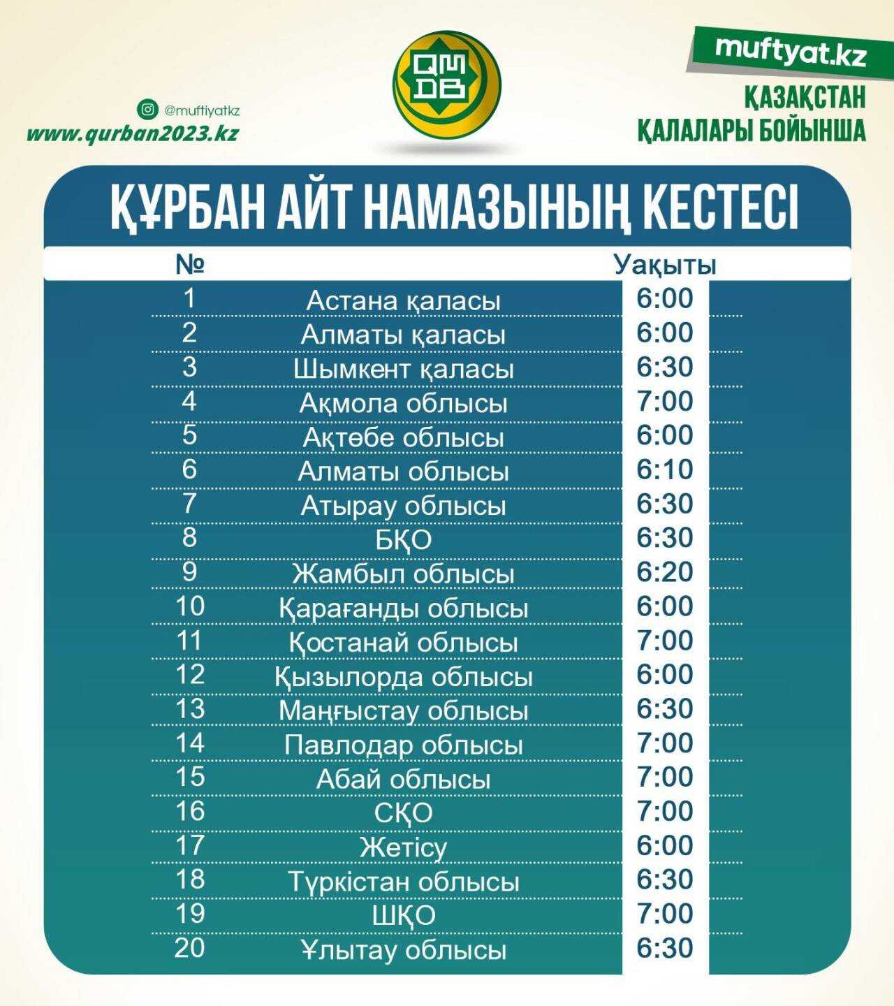 Расписание айт-намаза в разных регионах Казахстана / Инфографика ДУМК