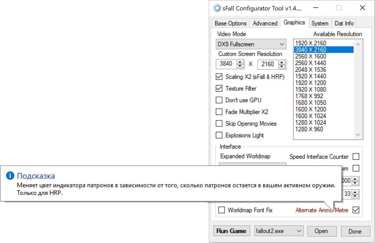 Примером отличной работы с классикой оказались Fallout и Fallout 2. Потрясшие мир 640*480*256 явно достойны большего. Фанбаза у игр огромная, и неудивительно, что позволяющие выводить вполне приличную для нашего времени картинку инструменты давным-давно созданы. Самый популярный пакет именуется Sfall и описан авторами как «комплект для создания города-рая модификации движка». На то, сколь давно он в строю, намекает встроенный рендер утилиты: это DirectX 9.0c.