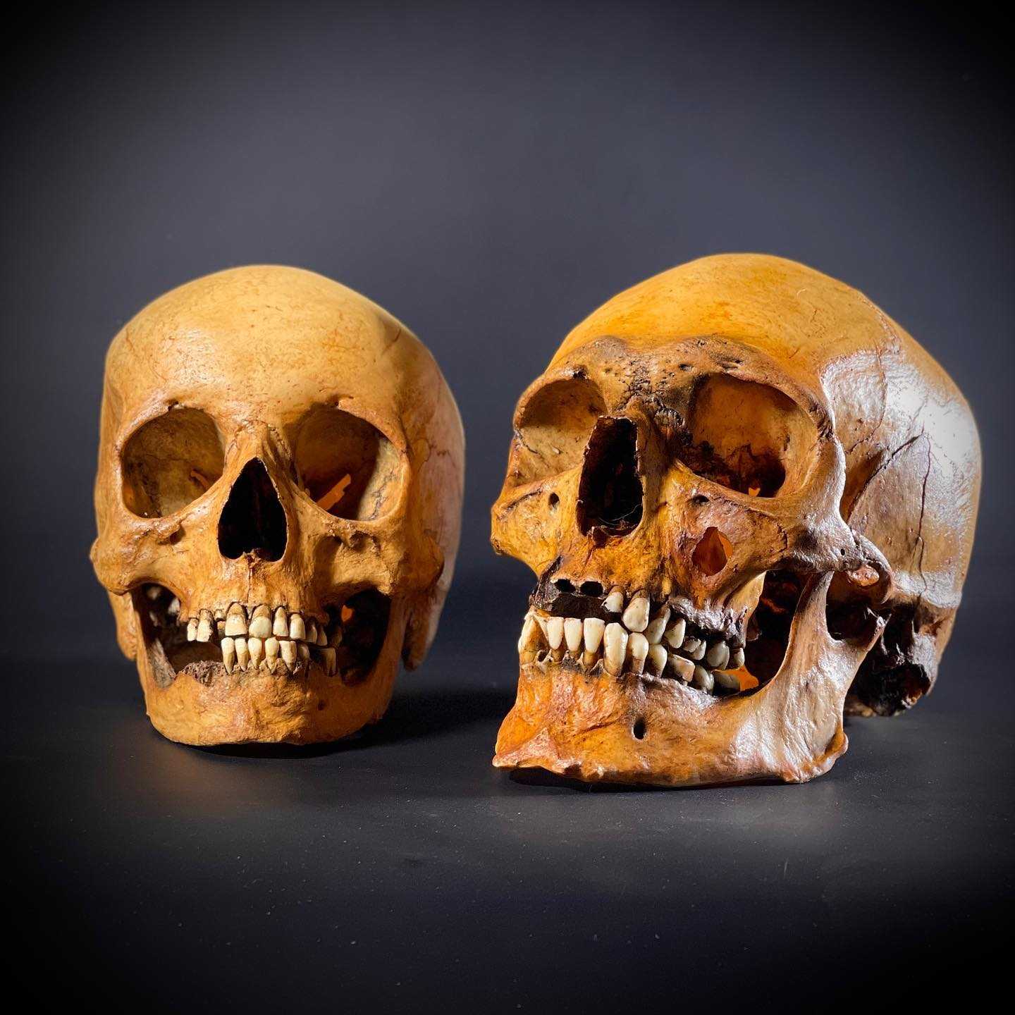Гиперреалистичные копии черепов от мастерской Купи Череп: женский азиатский и мужской европейский. Точные копии черепов, которые когда-то принадлежали живым людям. Ручная работа, ручное окрашивание, имитирующее настоящий оттенок костей человека. Зубы отлиты отдельно и вклеены, нижняя челюсть – отдельный элемент.