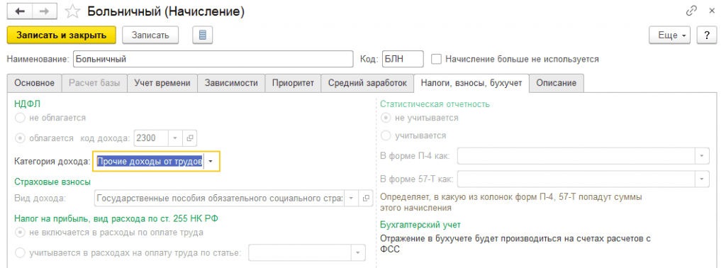 В программе «1С:Зарплата и управление персоналом 8» редакции 3 для квалификации начислений в этом разрезе устанавливается Категория дохода в карточке плана видов расчета Начисления на закладке Налоги, взносы, бухучет (рис. 1). В поле Категория дохода может быть выбран один из вариантов: