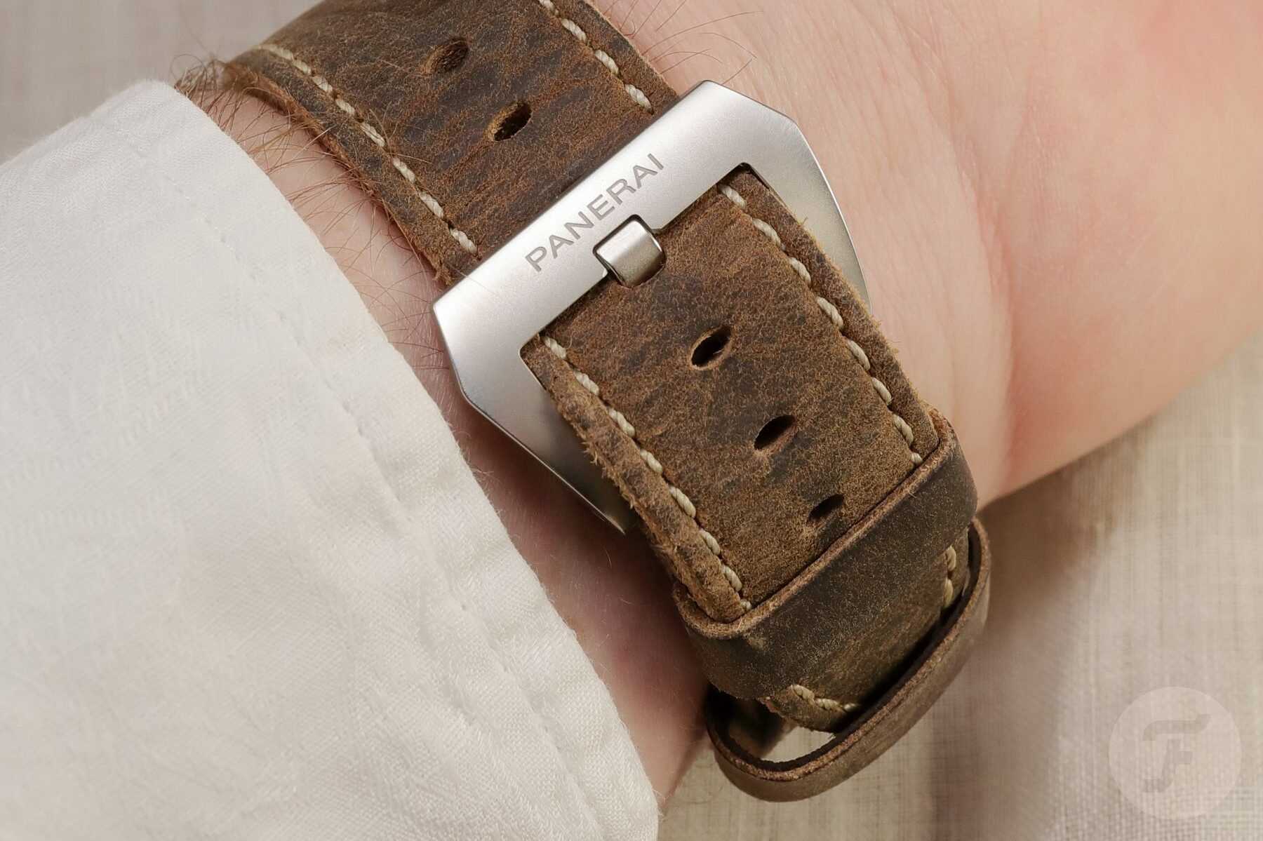 Средне-коричневый замшевый ремешок часов удивительно мягкий. Характерная для Panerai мощная трапециевидная застежка-штифт создает оптический противовес большой головке часов.